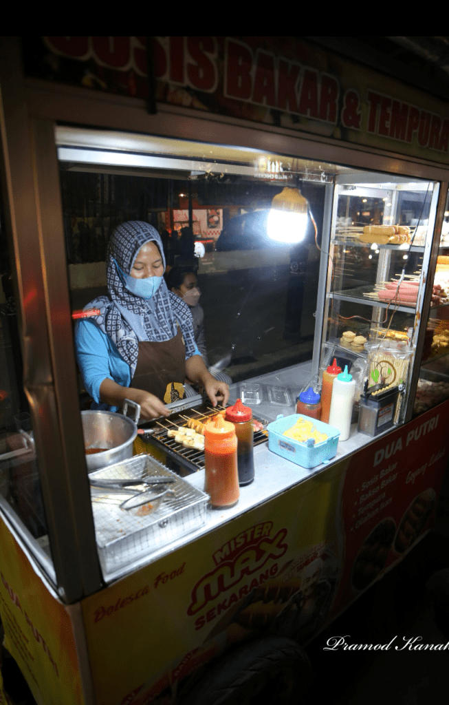 The street right in front of the temple’s eastern gate turns into an illuminated food rendezvous after dark. Modified cars and vans with colourful lamps decorating their chassis take curious children on a ride around the town. There are VW open vehicles that ostentatiously take tourists here and there. Their colourful bodies do not fail to attract anyone who visits the town first time. And there are the food carts that sell anything Indonesian, Thai, Korean and western delicacies. Visitors from bigger cities may see this as the locals’ desire to create a global environment for themselves in a small historical town. Under the hanging lamps in their carts, the vendors prepare various foods – Mie Bakso, Nasi Goreng, Sosis Bakar, Takoyaki, Kimchi, Burger and what not. Right in front of the gate of the temple that closes after 5 pm is a local artist who arranges tiny canvases for children to paint their favourite toon characters. Not far away from this, smoke rises from a sate vendor’s charcoal signalling the start of the evening food hunt.