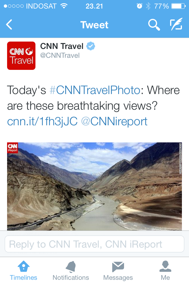 It is a matter of great pleasure when the giants in the travel publications industry such as Lonely Planet, BBC Travel and CNN Travel recognise your photos and retweet and even publish them on their pages. I have been lucky in 2014 that several of my travel pictures were able to be the cynosures of their eyes. Lonely Planet retweeted two of my photos in tandem (within a week) on Twitter. Very soon the pics got retweeted many times by LP fans across the world. Both pics are from my latest Ladakh trip (June 2014). And, CNN Travel selected one of those pictures as Travel Photo of the Day. It was a great time in Ladakh among the Himalayas. The trip was both adventurous and admirable. I had difficulty breathing in and out of the hotel, but was truly entranced by the never-ending charm that is Ladakh! Here are the pictures. Thank you, LP and CNN.